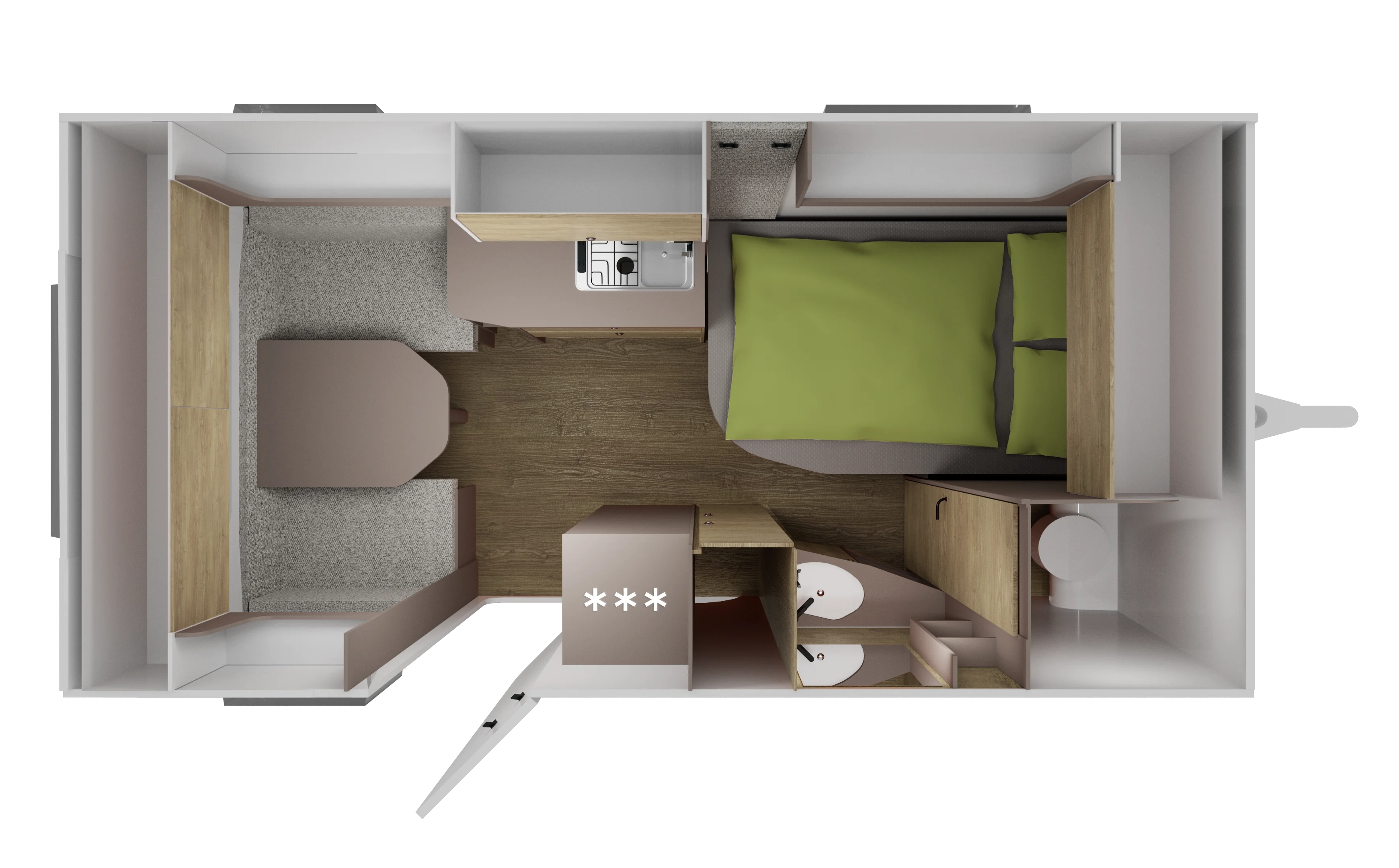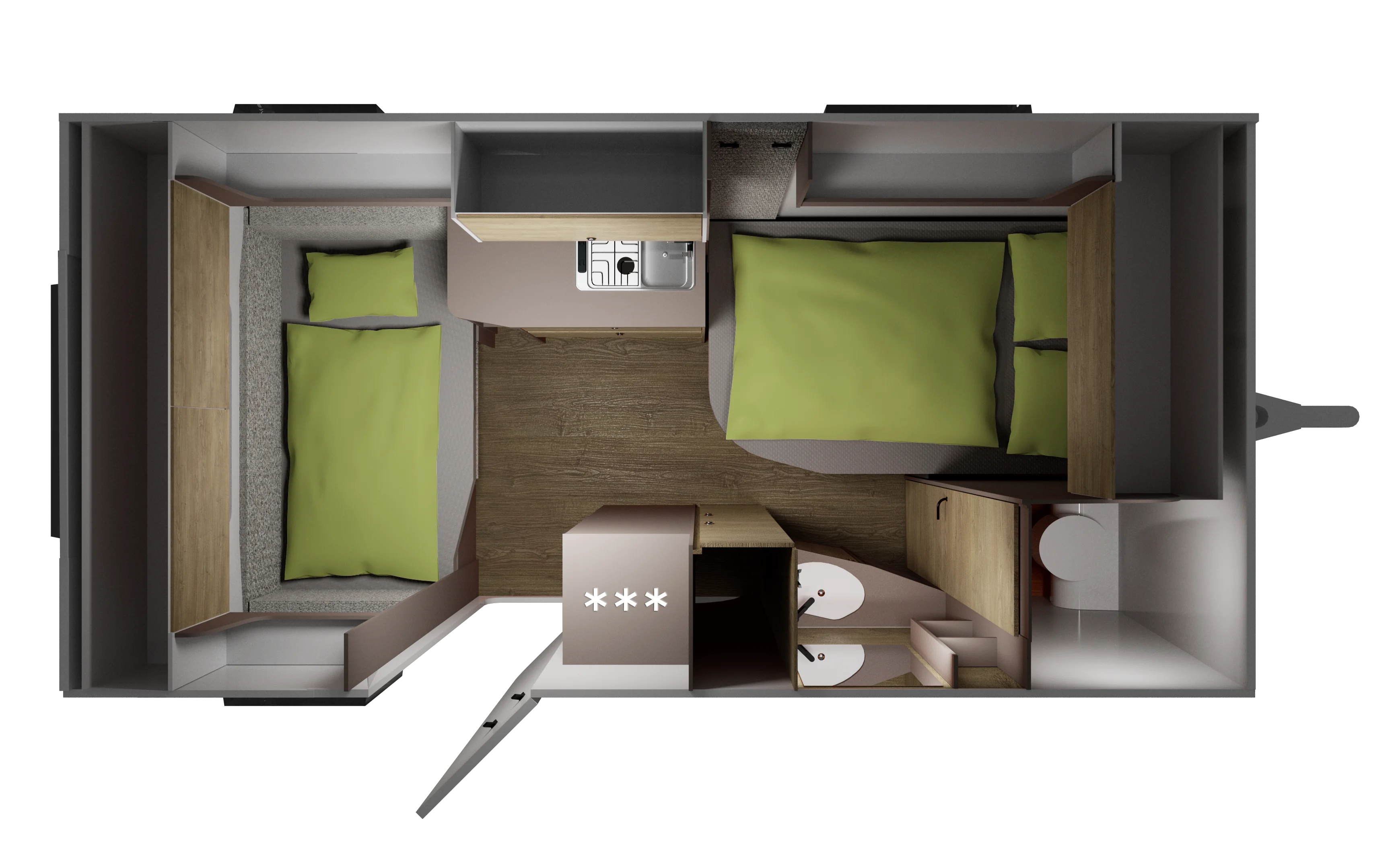 Den lille campingvogn til 2-3 personer tilbyder alt til NEXT-generationscamping: et stabilt chassis, god isolering, ferskvandstank med ekstern påfyldning, varme, soveområde, et funktionelt tekøkken med kogeplader og opbevaringsplads samt et vaskeområde med toilet.